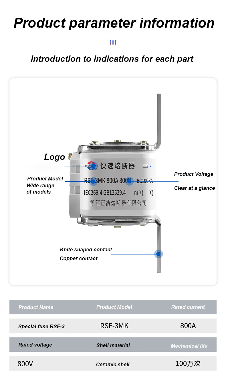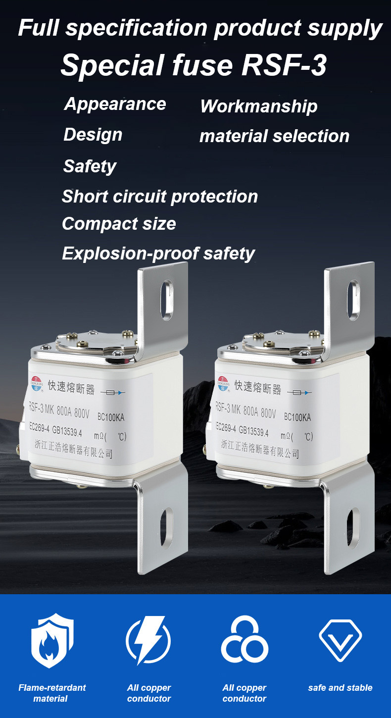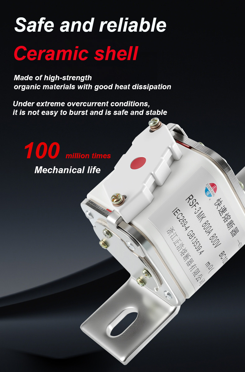 έχει ονομαστική τάση 500V και ονομαστικό ρεύμα 315Α, που μπορεί να εξασφαλίσει αποτελεσματικά την ηλεκτρική ασφάλεια, να αποτρέψει την υπερφόρτωση και το βραχυκύκλωμα. Σύνδεσμοι ασφαλειών RSF-3MK 800V-800A BC100KA